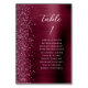 Der links Rand dieser eleganten modernen Hochzeitskarte mit einer Bordeaux-Imitat-Glitzer-Tischnummer. Das Wort "Tabelle" und die Tischnummer erscheinen in der weißen Handschrift auf einem bordeauxroten Imitat mit Metallhintergrund. Fügen Sie die Namen Ihrer Gäste hinzu, die jeder Tabelle zugeordnet sind.