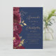 The left-hand edge of this elegant modern wedding invitation features a burgundy floral border trimmed with gold faux foil foliage. The customizable text combines gold-colored script and sans serif fonts on a navy blue background. The reverse side provides space for wedding details, along with a QR code guests can scan to visit your website and RSVP, which saves the cost of printing and mailing separate RSVP cards.