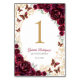Burgundy gold Quinceanera celebration table number cards. Features, script font, gold butterflies, watercolor roses and tiara. Perfect for an elegant princess style glam celebration. Personalize with your own details. Printed Zazzle invitations or instant download digital printable template.