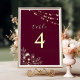 Elegante Hochzeitskarte mit tiefburgundigem Hintergrund, romantischen Saitenlichtern und goldblühenden Spitzen. Dieses Tafelschild eignet sich perfekt für Herbst- oder Abend-Empfänge und fügt Ihrer Sitzanordnung eine stilvolle und koordinierte Touch hinzu.