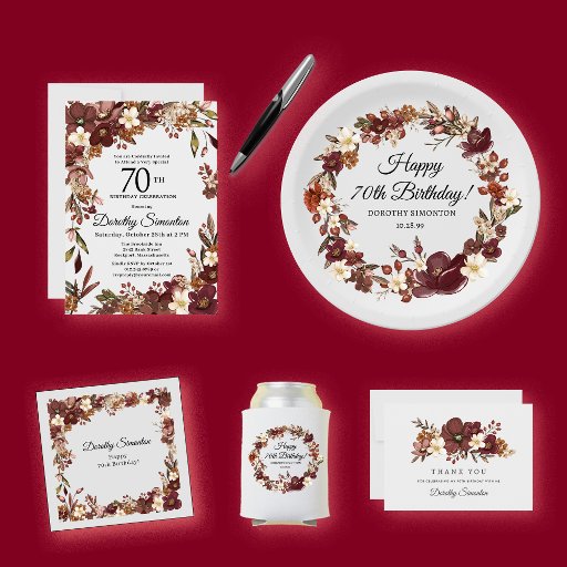 Burgundy Mauve Ivory Fall Floral 70th Birthday Einladung