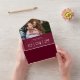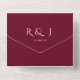 Eine elegante burgundische, minimalistische All-in-One-Hochzeitseinladung mit Ihrem Foto, einem besonderen Datum und einem Set für Hochzeitsdetails in klassischer, schicker Typografie. Die Einladung enthält eine perforierte RSVP-Karte mit Ihrem Hochzeitswebseiten QR Code und Details. Entwickelt von Thisisnotme©