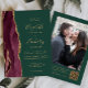 The left-hand edge of this elegant modern wedding invitation features a burgundy red watercolor agate border trimmed with faux gold glitter. The customizable text combines gold-colored handwriting, copperplate and italic fonts on a dark emerald green background. Add your favorite photo to the reverse side, along with additional text and a QR code to send guests to your wedding website.