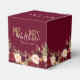 Personalisierte Gastgeschenk Hochzeit Box mit Burgundy roten floralen Aquarell Design, Gold Mr. & Mrs. handgeschriebenes Skript mit verheiratetem Nachnamen und Hochzeitdatum in weißem Schriftart Typografie-Overlay auf einem soliden Farbhintergrund gedruckt.