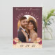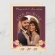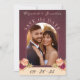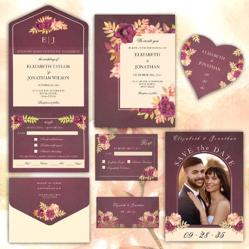 Elegante und romantische Save the Date-Karte mit Ihrem Lieblings-Foto, mit Aquarellfarben-Rose mit Herbstblättern in kräftigen, warmen, erdigen Farben auf bordeauxrotem Hintergrund. Die Aquarellblumen auf der Rückseite der Karte sind mit Blätter aus Gelb, Grün, Bronze und Terrakotta auf beigem Hintergrund mit einem Monogramm versehen. Personalisieren Sie die Details: Braut- und Bräutigamen, Datum und Initialen. Für weitere passende Hochzeitsartikel schauen Sie bitte in meine Romantic Burgundy Herbst Hochzeit im Herbst Collection.