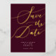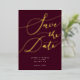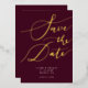 Elegante Save the Date Karte mit handgeschriebenem Kalligrafietext, der auf bordeauxrotem Hintergrund "Save the Date" in Gold steht. Sie können ein Foto auf der Rückseite hinzufügen.