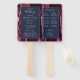 Dieser elegante, moderne Hochzeitsfan besticht durch einen bordeauxroten Hintergrund mit silberfarbenem Imitat-Glitzer. Der Text erscheint in silbergrauer Handschrift und kopperplate-Schriftart auf einem marineblauen Rechteck.