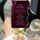 This elegant, modern wedding program fan features a burgundy red agate background trimmed with silver faux glitter. The text appears in silver gray handwriting and copperplate fonts.
