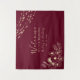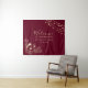 Rustikale, elegante, boho bordeauxrote Begrüßungskulisse mit vergoldeter goldblühender Spitze, Saitenleuchten und moderner Kalligraphie-Schrift.