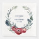 Eine Aquarellfarbe, blaue Wacholderzweige, Eukalyptusblätter, wildeburgundische rote Rosen und marineblaue Beeren erinnern an das Set dieser eleganten Winterhochzeit mit Ihren Namen und numerischem Datum in einer rustikalen Blockschrift.