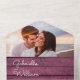 Alles in einer Hochzeitseinladung mit hübschen Saitenlichtern, Ihrem Foto, Monogramm-Initialen und eleganter moderner minimalistischer Typografie auf einem rustikalen bordeauxroten Holzpaneelhintergrund. Die Einladung enthält eine perforierte RSVP-Karte, die für Sie individuell adressiert oder links als leere Karte für die Handschrift der Adressdaten Ihres Gastes verwendet werden kann. Entwickelt von Thisisnotme©