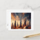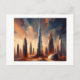 Ein surreales Stadtbild mit hohen Wolkenkratzern in leuchtenden, strahlenden Farben unterstreicht eine futuristische urbane Szene. Der zentrale Hochhaus dominiert die Skyline, umgeben von einem dramatischen Himmel mit einem Gefühl von Energie und Bewegung.