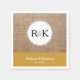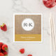Diese einfache und moderne Hochzeitsserviette zeichnet sich durch einen weißen Kreis mit dem Monogramm der Braut und Bräutigam auf einem Foto mit Burlhintergrund aus. Maßgeschneiderter Text auf einem goldenen Hintergrund in der Nähe des Untergrundes, mit den Namen der Braut und des Bräutigams und ihrem Hochzeitstermin.