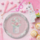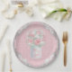 Burlap- und Mason-Glas Babydusche Teller mit schönen rosa Rose und Baby Atem Mason Glas auf einem hübschen rosa und silber weiß Burlap wirbeln Hintergrund. Diese rustikalen Burlap-Mason Babyduschpapier-Teller sind einfach für Ihre Veranstaltung angepasst, indem Sie einfach den Text Ihrer Wahl, oder Sie können den Text zu löschen.