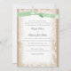 Imitate mit ländlicher Einengung bedruckt in warmen Brauntönen und weiße Spitzen und eine hübsche, minzgrüne Band Hochzeitseinladung. Alle Teile dieser Einladung sind gedruckt, keine echte Spitze oder Band ist beigefügt.