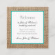 Diese Begrüßungsgeschenkkarte bietet ein Foto Burlap als Hintergrund und eine weiße Box mit einem aquamarinen Rand und anpassbaren Text, der Ihre Gäste aus der Stadt begrüßt. Diese Karte ist so konzipiert, dass sie ein Geschenk für Gäste begleitet, die zu Ihrer Hochzeit gereist sind und in einem Hotel einchecken.