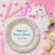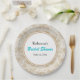 Diese Brautparty-Papiertafel (Einwegplatte) weist einen Hintergrund mit einer Rutsche mit weißem Spitzen-Overlay auf. Die Mitte der Platte ist weiß und enthält eine anpassbare Textdatei für den Namen der Braut und das Datum ihres Brautparty.