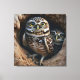 Zwei Eulen mit auffallend gelben Augen, die in einer Schmutzkeule stehen, deren Federn eine Mischung aus braunen und weißen Mustern aufweisen