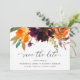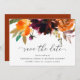 Rustikale Hochzeit mit bohobolder Blütenpracht Save the Date mit einem blumengeschmückten Blumenstrauß in warmen und erdigen Farbtönen gebrannter Orange, Terrakotta und tiefbordeauxfarbener Farbe sowie einigen Grünpflanzen. Dieses elegante Save the Date mit den reichen Herbsttönen ist ideal für eine Hochzeit im Herbst.
