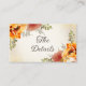 Moderne und elegante brunnende Orange- und Korallenfarben Blumen und Grün Herbst/botanische Landhaushochzeit 2-seitig Hochzeitsdetails Karte. Diese Karte gibt Ihren Gästen Informationen über Ihre Hochzeitswebsite und wie sie online reagieren können.