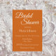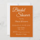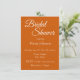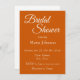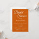 Einfache Stil, Brautduscheinladung, mit einem trendigen, orangefarbenen Hintergrund, mit dem Namen und Veranstaltungsort der zukünftigen Braut, dem Party, dem Kontakt usw., bedruckt in weißer, stilisierter Schrift. Personalisieren Sie Ihre Einladung, indem Sie Text durch eigene Brautparty-Informationen ersetzen. Wählen Sie Ihre Einladung Papier Stil und Quantität.