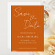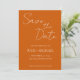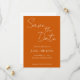 Einfache Hochzeit im Stile rette den aktuellen Einladungen, die mit einem weißen, stilisierten Skript auf einem trendigen, verbrannten orangefarbenen Hintergrund versehen sind. Bearbeiten und ersetzen Sie Namen, Datum und Position mit Ihrem eigenen. Wählen Sie Ihre Einladungsgröße und Ihren Papierstil aus.