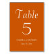 Begleiten Sie Ihre Hochzeitsgäste mit dieser schlichten Tischnummer-Karte, die mit weißen, stilisierten Schriftzeichen auf einem trendigen, verbrannten orangefarbenen Hintergrund versehen ist. Design ist auf jeder Seite der Karte. Bearbeiten Sie Ihre Karte, um die Tischnummer, die Namen und das Datum des Ehepaares zu ändern. Bestellen Sie Karten für jede Tischnummer separat.