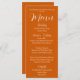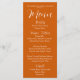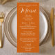 Einfache Stil, verbrannte orangefarbene Dinner-Karte für Ihre Hochzeit, die mit weißem, stilisiertem Drehbuch zusammen mit Ihren personalisierten Informationen. Bearbeiten Sie die Menükarte und ersetzen Sie die Namen und das Datum der Hochzeiten, sowie die Menüpunkte, die an Ihrem Hochzeitsempfang serviert werden. Wählen Sie den gewünschten Menükartenstil aus.