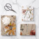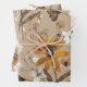 Set von 3 Wrapping Paper Sheets zeigt elegante fallblumengeschmückte botanische Garten-Wildblume-Designs mit schlicht verbrannten Orange-, Weiß- und Lila-Blumen und Blattwerk auf weißem und braunem Hintergrund.