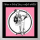 Blond mit langen Beinen und hohen Fersen sitzen im Stuhl bereit zum Diktieren. "Ich habe viele sehr nützliche Fähigkeiten!" Die Farben sind rosa und schwarz