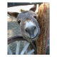 Dieser Miniaturburro, auch bekannt als Esel, scheint lächelnd zu sein, während er seinen Kopf über ein Wagenrad drückt, um Aufmerksamkeit zu erhalten.