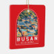 Busan Retro Vektor Reise Design. Busan, eine große Hafenstadt in Südkorea, ist bekannt für seine Strände, Berge und Tempel.