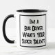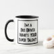 Ein lustiger Slogan auf einer Zwei-Tone-Tasse, der sagt: "Ich bin Busfahrer. Was ist DEIN Super Talent?" Zwei Tone Tasse für einen Busfahrer. Schwarzweißtext.