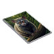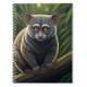 A bush baby with striking orange eyes sits calmly on a branch amidst lush jungle foliage. Its detailed fur texture and alert expression create a captivating scene.