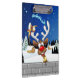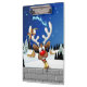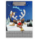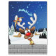 A Funny cartoon reindeer with a bright red nose and large white antlers, adorned with a red and gold bow, peeks through an open window. Outside, a snowy landscape with silhouetted pine trees and a small, glowing house is visible under a dark blue, star-filled night sky. Santa's sleigh pulled by reindeer is flying in the distance. The scene evokes a festive and whimsical Christmas atmosphere. Original Vector Art Copyright BluedarkArt TheChameleonArt.