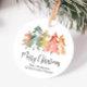 Elegante Geschenketiketten für Ihre Firmengeschenke an Kunden, Kunden und Mitarbeiter mit einer modernen Aquarellfarbe von Pinien in Salbei, Rot, Gold und Orange, "Frohe Weihnachten" in einem stilvollen Skript und Ihren Firmennamen in einfacher Typografie.