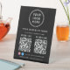 Berufliches Allzweckschild mit schwarzer Tischplatte für Ihr Unternehmen. Laden Sie Ihr Logo und 2 QR-Codes für Kunden hoch, um nach Bezahlung, Informationen, einer Liste Ihrer Produkte, Dienstleistungen, Preise, etc. zu suchen. Kennzeichnen Sie die QR-Codes und fügen Sie Ihren Firmennamen, Ihre Telefonnummer, Ihre Straßenadresse, Ihre Website oder andere Informationen in einfacher weißer Schrift hinzu. Fügen Sie auch Ihre facebook und instagram Benutzer-ID für Kunden zu folgen Sie online.