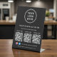 Simplify customer engagement and showcase everything your business offers with this custom 3 QR codes black pedestal sign, designed for modern, high-traffic counters and reception areas. Featuring your logo, business name, Facebook and Instagram social media handle, and minimalist white lettering, this professional tabletop sign allows you to display up to three scannable QR codes, each with its own custom label. Perfect for directing customers to multiple destinations -- such as menus, services, pricing, booking pages, payments, reviews, social media, or Wi-Fi. Ideal for restaurants, cafés, salons, spas, retail stores, clinics, offices, events, and pop-up shops, this multi-QR pedestal sign reduces clutter, replaces printed handouts, and presents your brand in a polished, professional way.