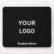 This black mousepad has a display image. You can replace the image with your business logo. A line of white display text is under the image. The text can be edited to show a custom message such as your business name. The white text is bold.