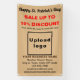 Alles Gute zum St. Patrick's Day! Ein weiterer Feiertag, um diesen März zu feiern und auch Ihr Unternehmen zu werben oder Ihren Markennamen zu fördern. Grün ist immer die Farbe für diesen Urlaub, aber versuchen Sie auch andere Farben. Maßgeschneidertes hellbraunes Banner mit Saint Patrick Sale, Ihrem Firmennamen und weiteren Informationen. Dies kann die Farbe sein, die zu Ihrem Geschäftsfarbschema passt. Banner, die Sie als Marketing-Material verwenden können, um mehr Kunden zu gewinnen. Anpassen und anzeigen, um mehr Kunden davon zu überzeugen, Ihre Produkte oder Kunden zu kaufen, um Ihre Dienstleistungen zu mögen. Inhalte sind Happy Saint Patrick's Day Gruß, Verkaufstexte mit Prozent Rabatt, die Sie anbieten, Verkaufstermine, Ihr Firmenname, Logo, Adresse, Telefonnummer, E-Mail und Website oder Ihre Business Social Media-Seite. Bitte Karo des Erscheinungsbildes nach dem Hochladen von Logos und Schriftzeichen. Wenn Ihnen das Aussehen gefällt, können Sie jetzt Ihre Bestellung aufgeben. Wenn Sie das Logo und die Texte ändern und verschieben müssen, um auf dieses Banner oder auf die gewünschte Größe zu passen, ändern Sie bitte das Design-Tool. Sie können auch die Hintergrundfarbe, die Farbe des Schriftartes und den Stil des Schriftartes im Designwerkzeug ändern. Wir wünschen Ihnen viel Glück, Freude und mehr Umsatz in diesem Urlaub.