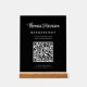 Modernes, schwarzes Acryl-Tischschild mit Ihrem Namen in einer stilvollen weißen Schrift und Geschäftstyp in schlicht weißer Schrift. Geben Sie Ihre Website-Adresse ein, um einen skalierbaren QR-Code für Kunden und Kunden zu erstellen, um Ihre Produkte, Dienstleistungen, Stunden usw. anzuzeigen.