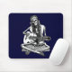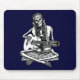 Stift u. Tinte langhaariges Hippieskelett, das mit überkreuzten Beinen auf einem gemusterten Kissen sitzt u. Gitarre spielt. Freundlich übertragen mit Losen des Details, über T - Shirts, Drucke, Geschenke.