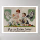 Lieblich Vintages Werbeplakat für Buster Brown Schuhe. Ein schönes Bild von einem kleinen Mädchen, das eine Puppe hält, und einem kleinen Jungen, der ihre schönen Schuhe bewundert.