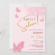 Eine niedliche und einfache Einladung mit rosa Schmetterlingen auf einem rosa Hintergrund. Nachahmung goldener glitzernder Typografie