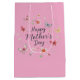Happy Mother's Day medium gift bag with floral and butterfly pattern on a plain pink background.