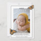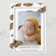 Feiern und verkünden Sie mit diesen wunderschönen Schmetterlingskarten Ihre größten Neuigkeiten! Teilen Sie Ihre glücklichen Neuigkeiten mit Familie und Freunden und zeigen Sie Ihren Stil! Die Karte zeigt die Kunst eines Monarchen Schmetterlings, der liebevoll um ein Foto des süßen Neugeborenen schwebt! Mit einer Grenze in schwarzem und klassischem Text sind diese zeitlosen Karten elegant und zeitgemäß. Text-Overlay lautet: "Treffen (der Name des Babys)", gefolgt von Raum, um sich mit den Geburtsstatistiken Ihres Babys oder allen Informationen, die Sie möchten, anzupassen. Backside verfügt über ein weiteres portrait Foto, denn wer kann vielleicht nur ein Bild von ihrem bezaubernden, wertvollen Baby wählen? Die Schmetterlingskunst von vorne ist auf der Rückseite für ein zusammenhängendes Thema gemustert.