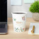 Eleganter Schmetterling Thema Geburtstagsparty-Tasse mit Illustration von rosa und minzgrün Schmetterlingen mit einem botanischen Garten.