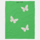Das Bild zeigt eine geflochtene Decke mit großen weißen Schmetterlingen in der Mitte auf einem dunklen, strukturierten Hintergrund mit subtilen Farbtönen lila und blau. Die Decke hat Ränder und enthält den passenden Platzhalter-Text "You text" in rosa an der Seite.