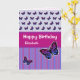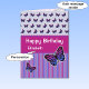 Ein modernes Geburtstagskartendesign, das Sie mit Ihrem eigenen Text und dem Namen des Empfängers personalisieren können. Das Farbschema ist rosa, lila und blau, und die Vorderseite besteht aus koordinierten Schmetterlingen und Streifen. Geben Sie die Felder ein, um den Gruß auf der Vorderseite "Glücklich Geburtstag", und den Namen zu ändern. Und ändern Sie die Nachricht innerhalb, oder verwenden Sie die angegebene "Wünscht Ihnen Liebe und Glück im kommenden Jahr".