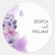 A romantic purple floral wedding sticker featuring soft watercolor flowers in lavender, blush, and white, accented with a delicate butterfly and elegant typography. This round sticker is perfect for sealing envelopes, decorating wedding favors, embellishing invitation suites, or adding a coordinated finishing touch to your floral wedding stationery set. A beautiful choice for couples who want a feminine and sophisticated purple wedding theme.